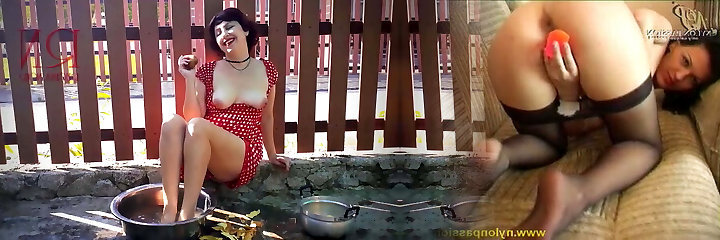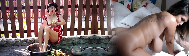 Retro Maid Prepares Potatoes For Dinner. Vintage Spectacle. Vintage Maid Without Panties. Masturbation Outdoors. Full