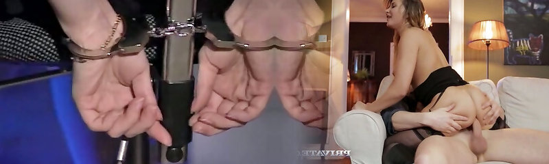 Busty blondie got her mouth strongly fucked being handcuffed on chair